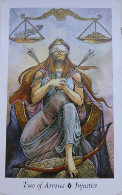 At the same time I kept getting the Two of Arrows – Injustice card in the Wildwood Tarot. It pictures the figure of Justice enthroned and blindfolded with two arrows crossed across her heart and her foot on a bow. Above her is a set of scales with a feather on one and a pile of coins on the other.