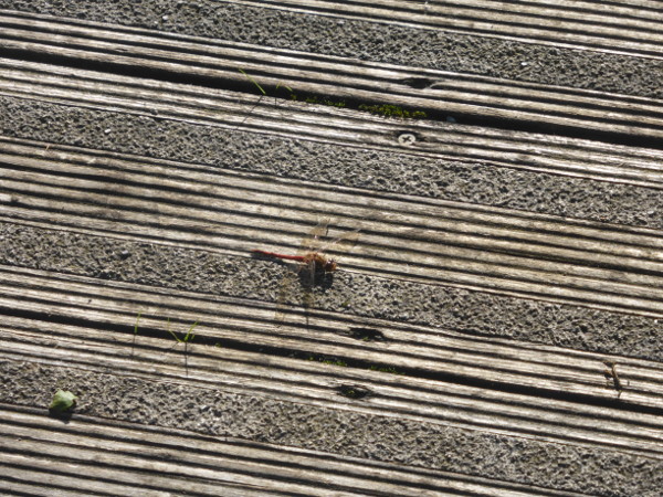 I didn’t know what he was right then, that he was a he, or a common darter. Only that I’d killed a dragonfly. I laid the broken pieces at the side of the cycle way with an apology to dragonfly kind and rode onward more slowly, more aware of other ruddy darters rising from where they were basking on the path. After I’d arrived, locked up my bike, they haunted me for the short period I was there. Flying in front of me, landing on the wooden walkways and handrails.