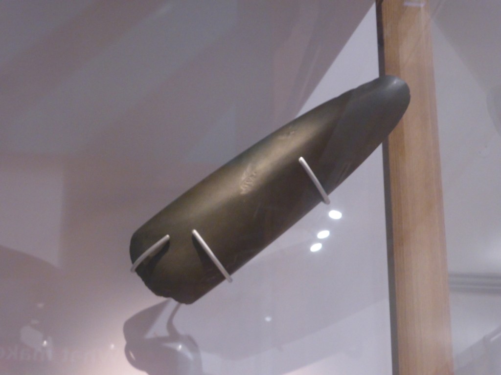 In the Harris Museum there is a beautifully polished stone axe which was found in the Ribble at Broadgate. The stone is smooth and grey-greenish. The larger cutting edge is sharp and rounded (although it looks like the lower portion may be broken) and the hafting end smaller, round, and smooth.