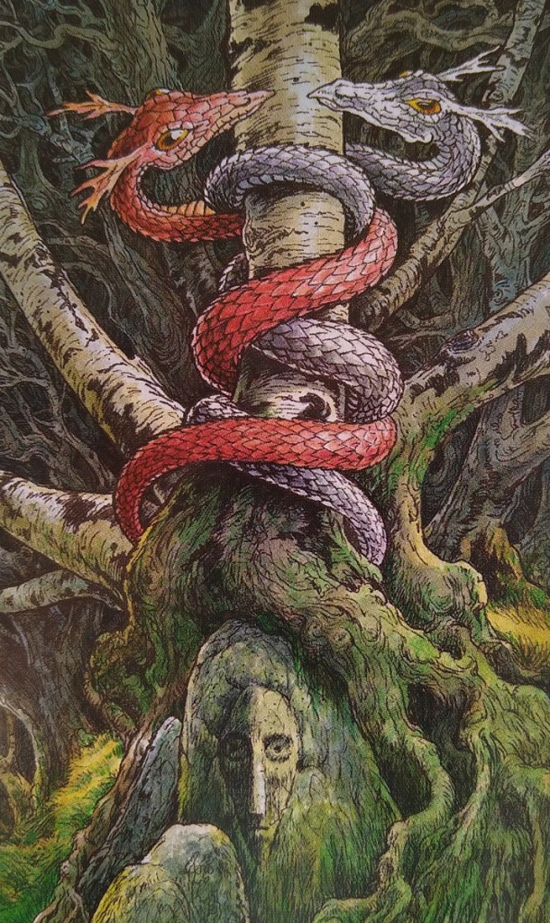 It would be impossible not to think of how the image of the serpentine bodies of the dragons intertwining looks like two strands of DNA and one alone like a single strand of RNA and to be reminded of the structure of a virus with its strand or strands carried within the stone chest of its capsid. Of how, like the dragons, viruses shift through a countless series of mutations before they sleep.
