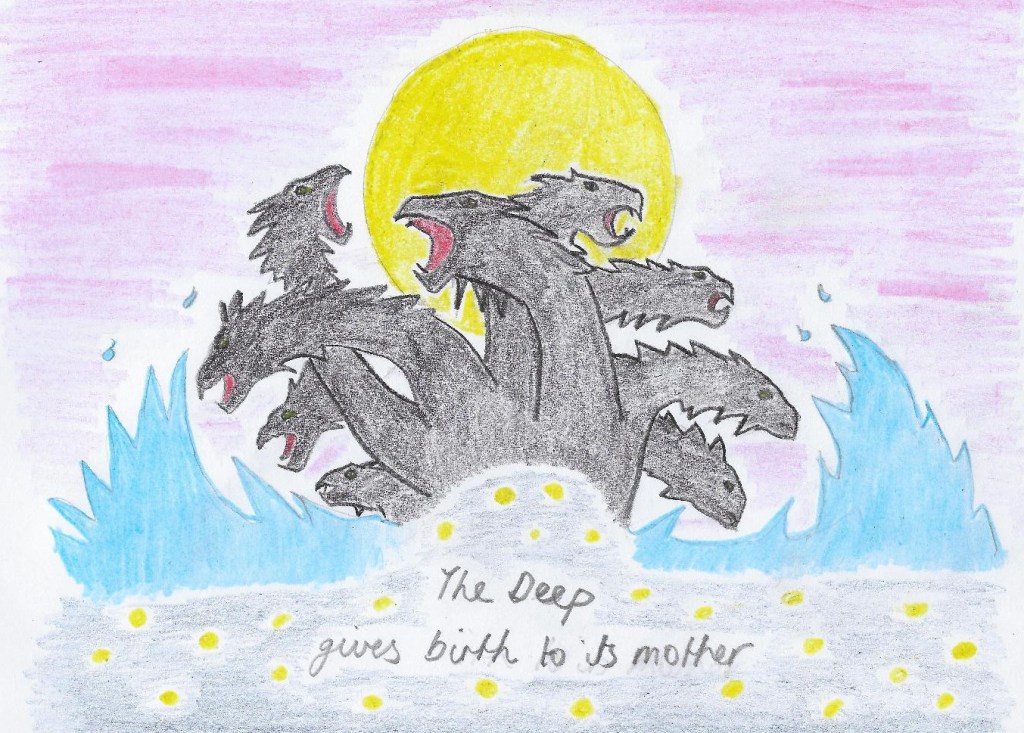 Yet her myths are lost. I have recently returned to the Babylonian creation epic, Enuma Elish, which features a dragon-goddess called Tiamat, who shares similarities with Anrhuna, to look for clues. Tiamat is a goddess of the salt sea. Her name may be cognate with the semitic tehom (‘the deep’ or ‘the abyss’) and she appears as a dragon or sea serpent. After she gives birth to the gods they turn on her. Against them she births an army of monster-serpents and puts her son, Kingu in the lead. Following a primal battle she is slain by the storm god, Marduk, and the world is created from her remains.