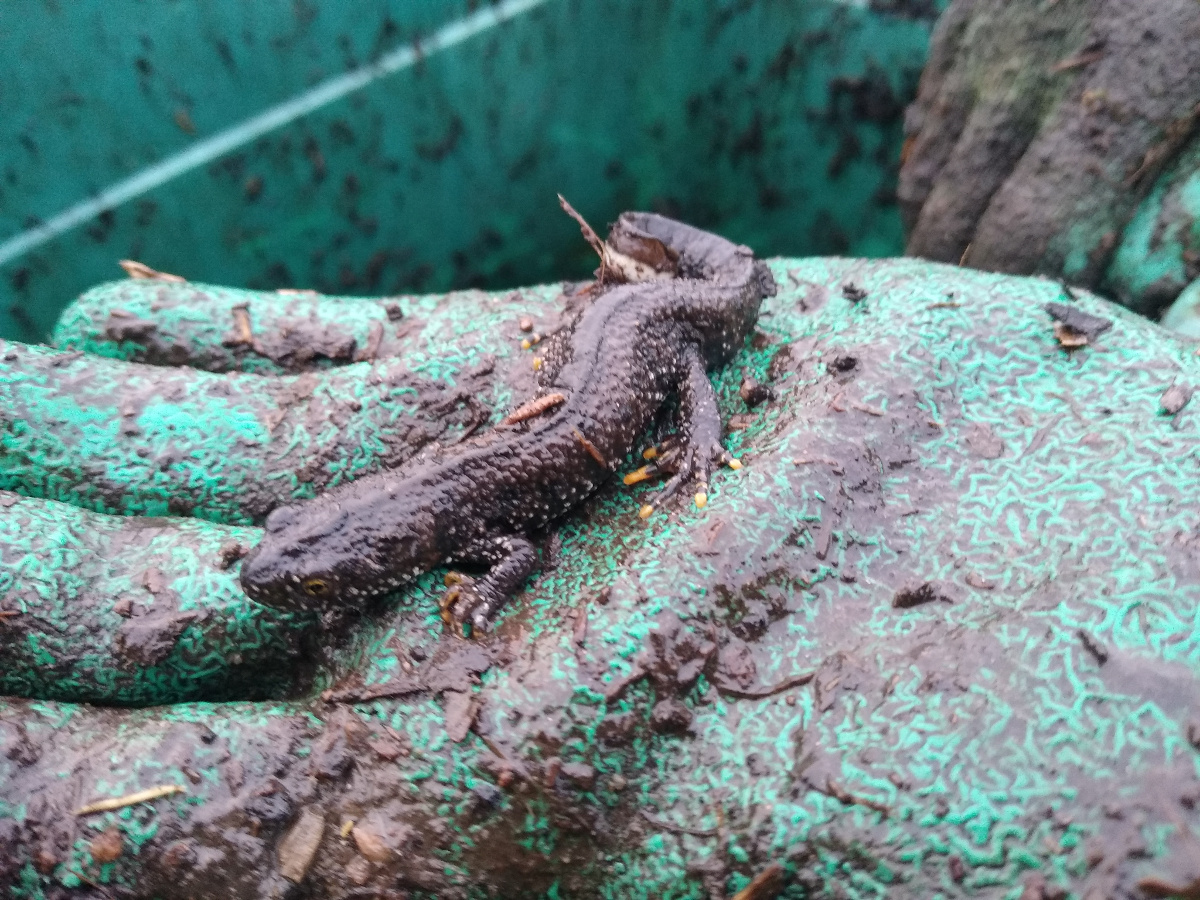 *I recently started a conservation internship at Brockholes Nature Reserve and the task of the volunteer work party on Tuesday was building habitat heaps from alder logs. Later in the day, serendipitously, Lorna Bennett, the reserve officer, found a great crested newt along with approximately 20 adult and juvenile smooth newts, 2 juvenile toads, and 5 frogs whilst moving some old compost bags. These amphibians have been placed safely into a habitat heap to hibernate over winter before they emerge in spring and hopefully head to the new ponds to breed. The ponds were created for them by LWT’s work with Natural England to remedy the decline in great crested newts.