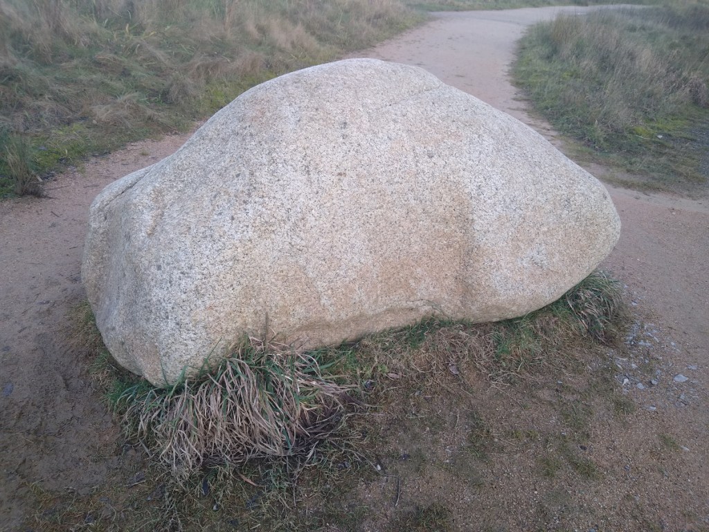 Outside the office at Brockholes Nature Reserve there is a 2.5 tonne boulder made of grandiorite which was extracted from Number One Pit beside the M6. Unlike the sandstone boulders nearby it does not fit with our local geology. This has led geologists to the conclusion it was transported from the Lake District or Southern Scotland by a glacier during the Last Ice Age 115,000– 11,700 years ago.
