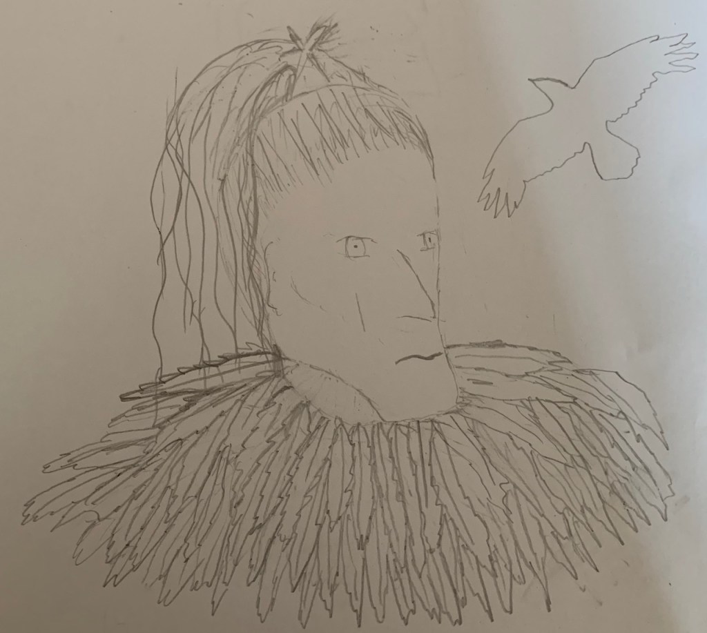 As part of the process of introducing Orddu and the Witches of Annwn into my daily practice as spiritual ancestors I am beginning to produce some devotional art for them as well as writing them poems and telling their stories. Here I am trying to capture Orddu’s characteristics as a ‘very black witch’ and ‘hag’ who battles against Arthur as presented in the original tale without inclining towards more traditional caricatures. I aimed to create the sense of harsh formidable and dark figure who was esteemed as a warrior woman and prophet. As you can probably tell I have no formal training as an artist just a history of doodling characters from writings of my own and others from a very young age.