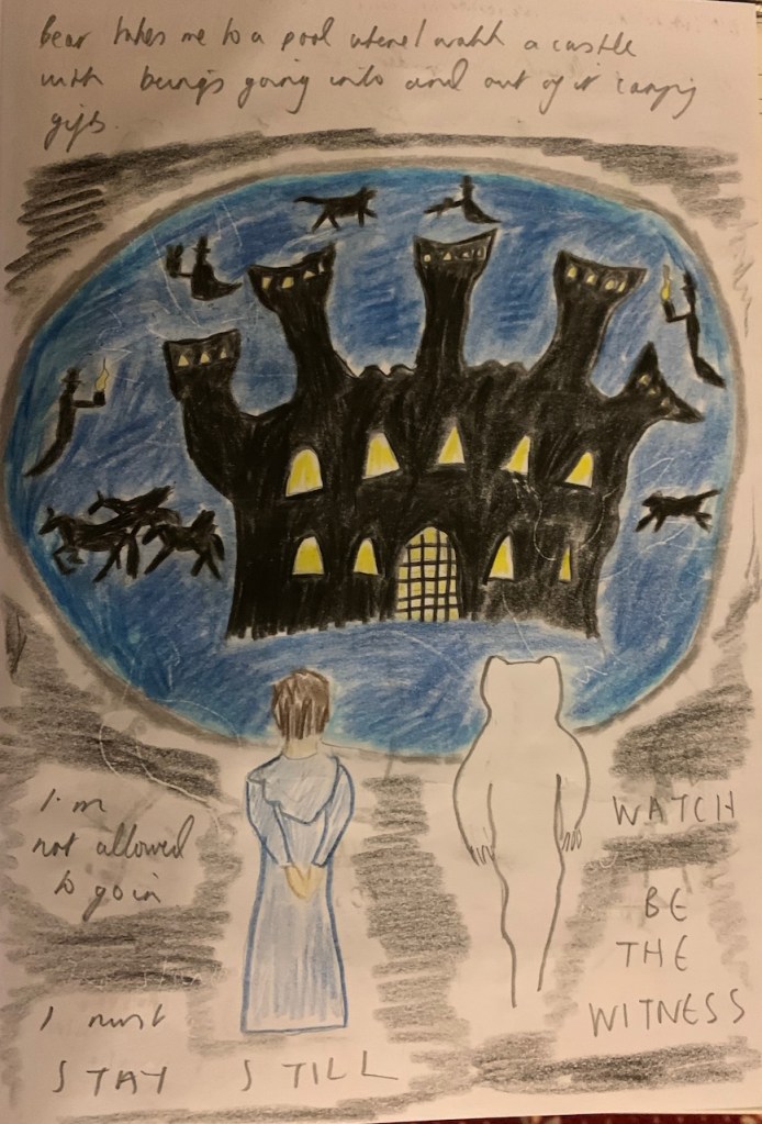 In a journey I narrated to my spiritual mentor I met a bear spirit who took me to witness the unfolding of a numinous vision of a dark castle in a pool with shadowy entities entering and leaving with gifts. I was told I was ‘not allowed to go in’. ‘I must stay still’ and ‘be the witness’. This was very hard as I like to do and understand things rather than simply witnessing. This has stuck with me as a lesson in the appreciation of mystery.