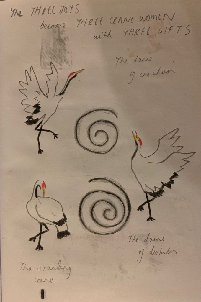 In one of my journeys behind a waterfall I discovered ‘three joys’ who appeared as three cranes to gift me ‘the dances of creation and destruction’ and ‘the standing crane’.