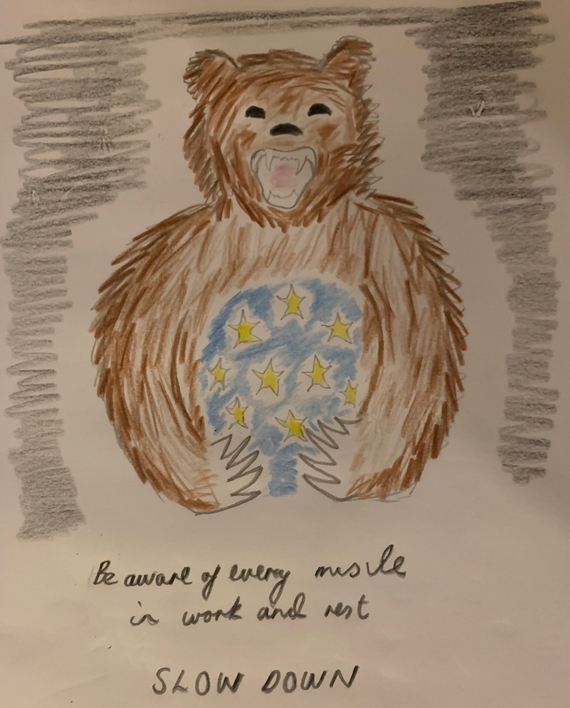 At the Way of the Buzzard*** Bear Necessities retreat a bear full of stars appeared to me and in a shapeshifting experience showed me how to be more grounded in my body by being aware of all my muscles and slowing down.