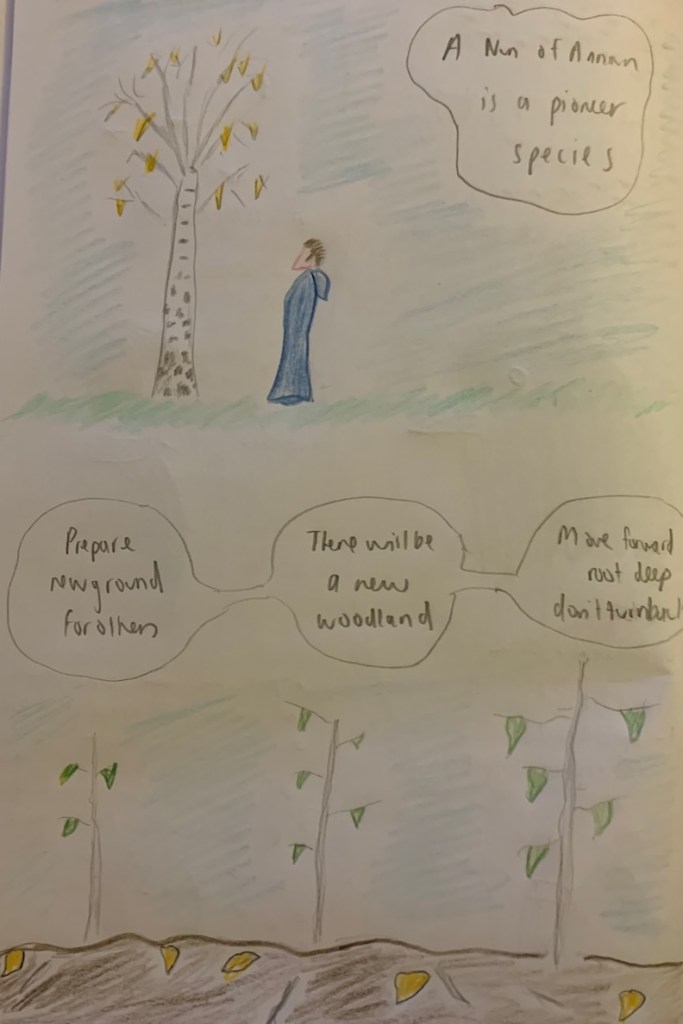 In this month’s Way of the Buzzard Mystery School journey circle the topic is ‘preparing new ground’ and we are working with birch, rowan or alder. The birch calls to me again and I receive some transfomative insights – ‘a nun of Annwn is a pioneer species’. I must ‘prepare new ground for others’, for ‘a new woodland’, ‘move forward’, ‘root deep’, and ‘not turn back’.