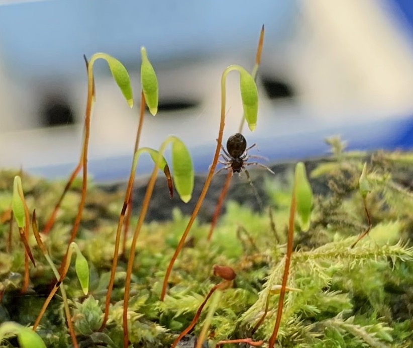 Yesterday I went for a New Year’s Eve walk with a friend around Longton Brickcroft Nature Reserve. The first thing I saw, on the gate on the way on in, was a small patch of moss with a tiny spider stringing a thread between the sporophytes. I think the moss is Creeping feather-moss (Amblystegium Serpens), but I’m not sure about the spider. The presence of palps shows its a male and I suspect it belongs to the Linyphiidae ‘Money Spiders’, likely one of the species impossible to identify without a microscope.
